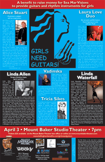 GIRLS NEED GUITARS began as a one -time event to help provide guitars and rhythm instruments for Sea Mar Visions, a residential substance abuse treatment program for teenage girls in Bellingham, WA.